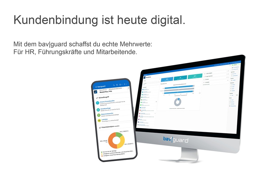 bavonline steht für die Digitalisierung und Automatisierung von Prozessen rund um die betriebliche Altersvorsorge (bAV), betriebliche Krankenversicherung und weiterer Benefits. Mit der innovativen SaaS-Lösung bav|guard unterstützt das Unternehmen Arbeitgeber, Vermittler und Berater dabei, Verwaltungskosten zu senken, Haftungsrisiken zu minimieren und die bAV effizient, transparent und rechtssicher zu gestalten.